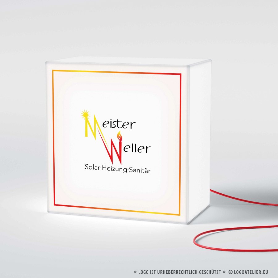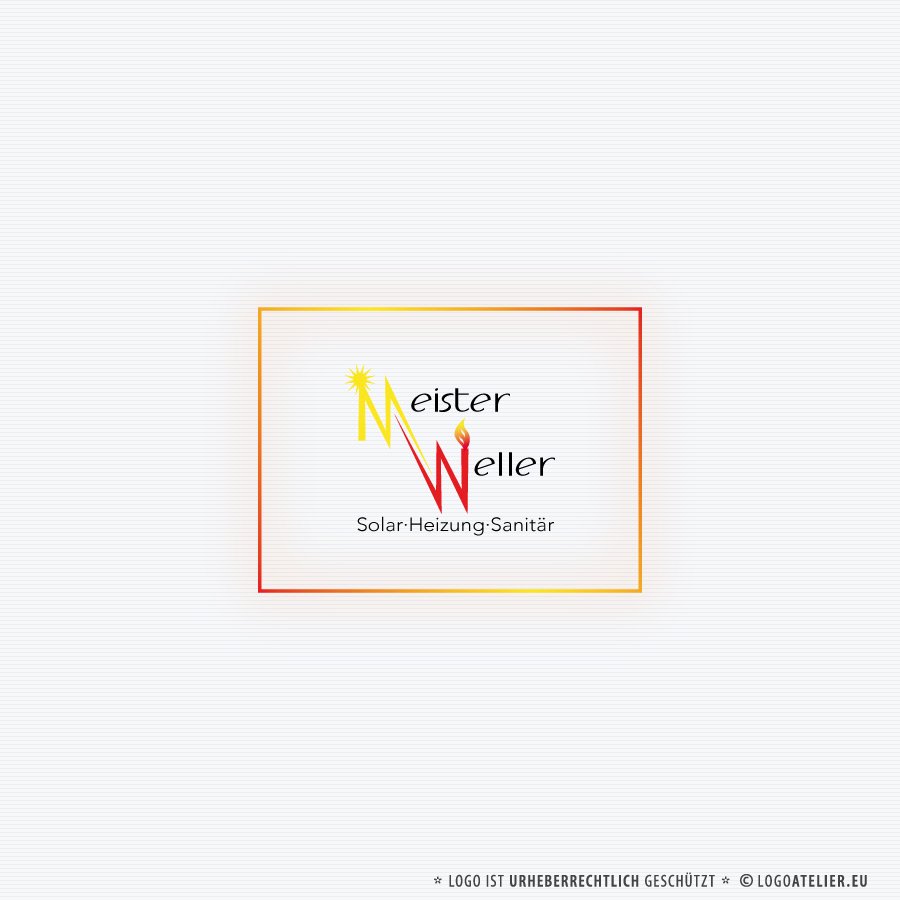 Ein rechteckig gerahmtes Markenzeichen mit farblichem Verlauf von Gelb zu Rot. Die Namensteile „Meister“ und „Weller“ bilden eine visuelle Stromlinie.