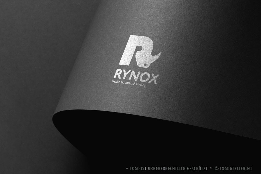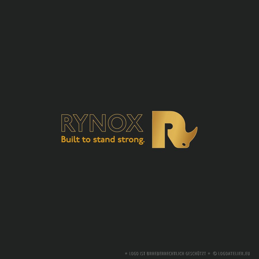 Rino Logo Nashorn Erfolgreich Stark Robust Baufirma Power Bulle Erhaben Hörner Kraftvoll Macht Männlich Muskeln Rhinozeros