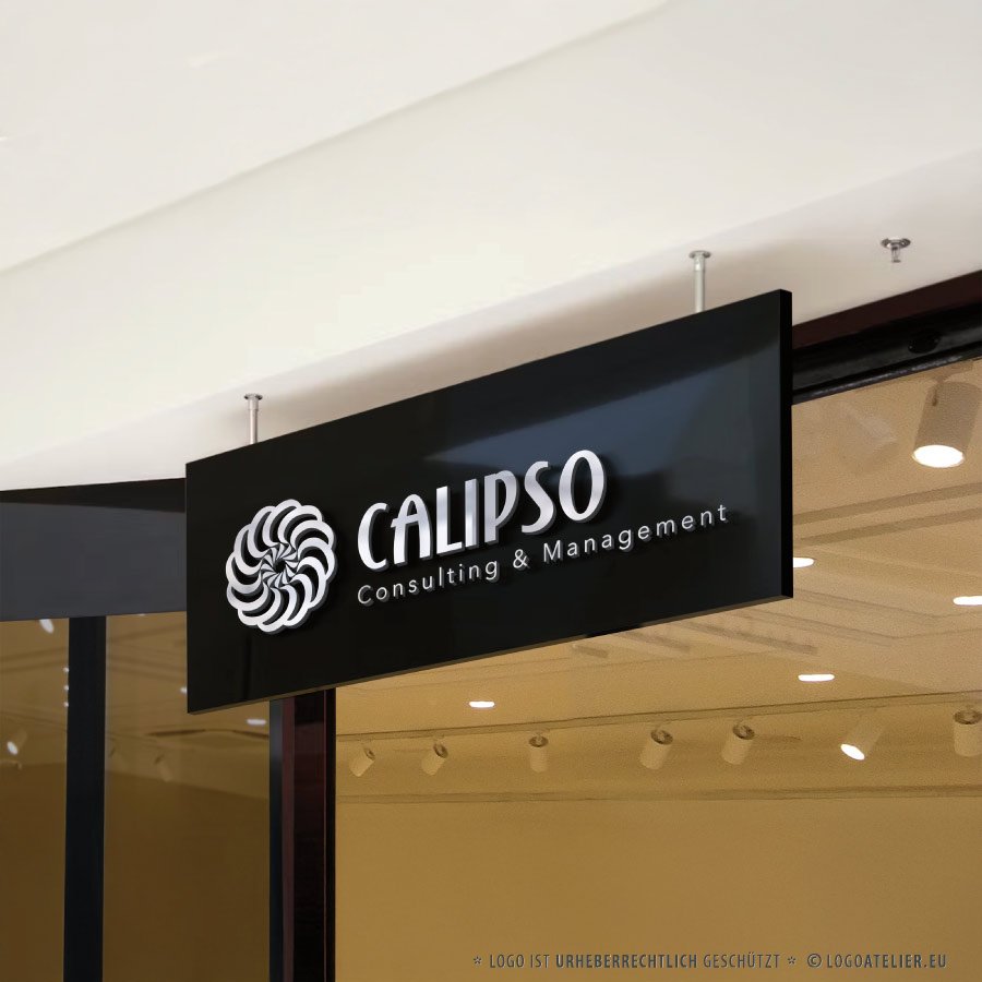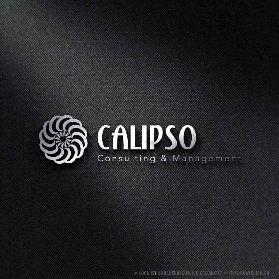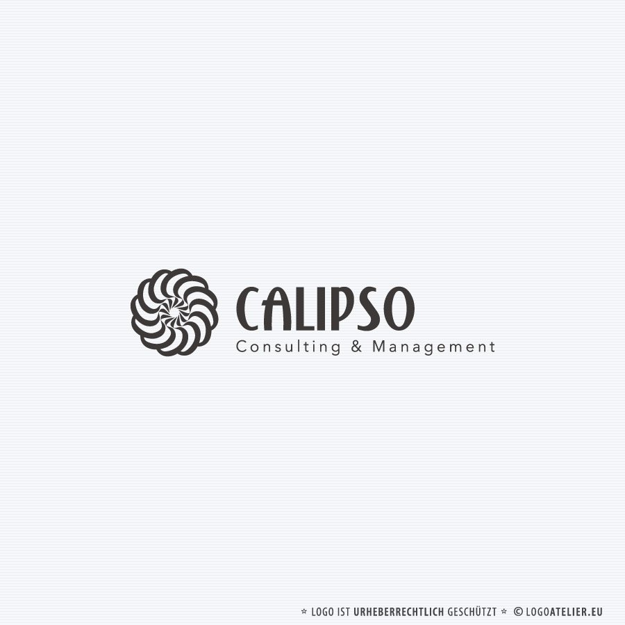 Das Logo zeigt eine kreisförmige, dynamische Symbolform, die aus ineinander gedrehten, spiralartig angeordneten Elementen besteht, rechts daneben der Schriftzug CALIPSO in modern anmutender, geometrisch gestalteter Schrift mit klaren Linien und abgerundeten Formen, ergänzt durch den kleineren Zusatz Consulting & Management.