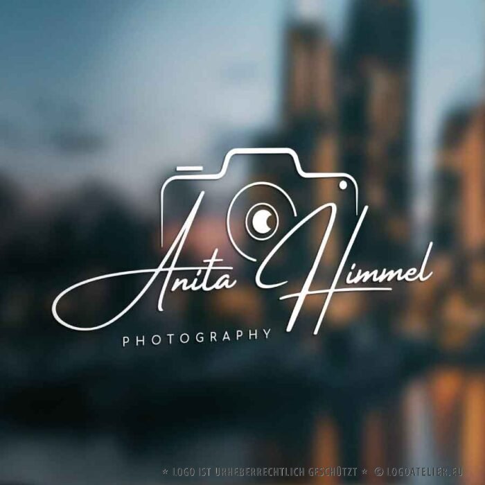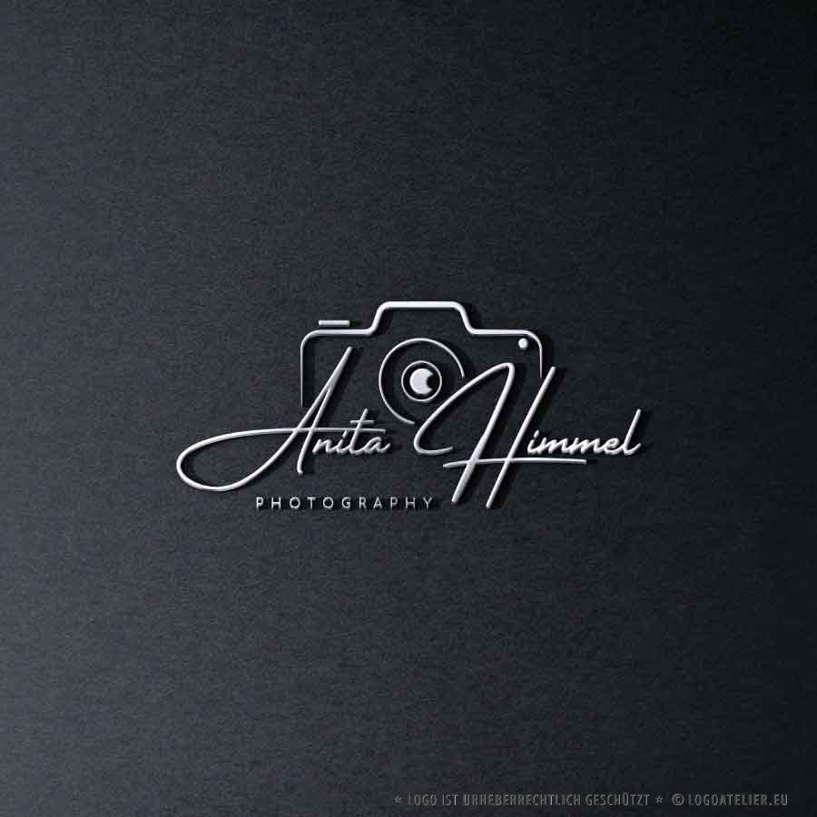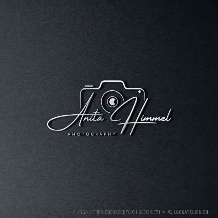 Das Logo für „Anita Himmel Photography“ vereint die elegante Outline einer Kamera mit einer schwungvollen, modernen Handschrift. Diese Gestaltung spiegelt Kreativität, Professionalität und persönlichen Anspruch wider – Werte, die für ein Fotostudio essenziell sind. Die dezent glänzende Silber-Optik auf dunklem Hintergrund vermittelt Exklusivität und künstlerischen Feinsinn.