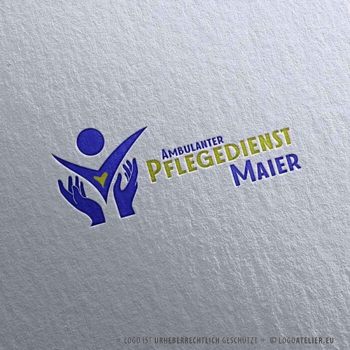 Das Logo von „Ambulanter Pflegedienst“ wirkt freundlich, fürsorglich und vertrauensvoll. Die stilisierten blauen Hände, die einen Menschen behutsam umschließen, symbolisieren Schutz, Unterstützung und menschliche Nähe. Das gelbe Herz als zentrales Detail steht für Wärme, Empathie und echte Zuwendung im Pflegealltag.