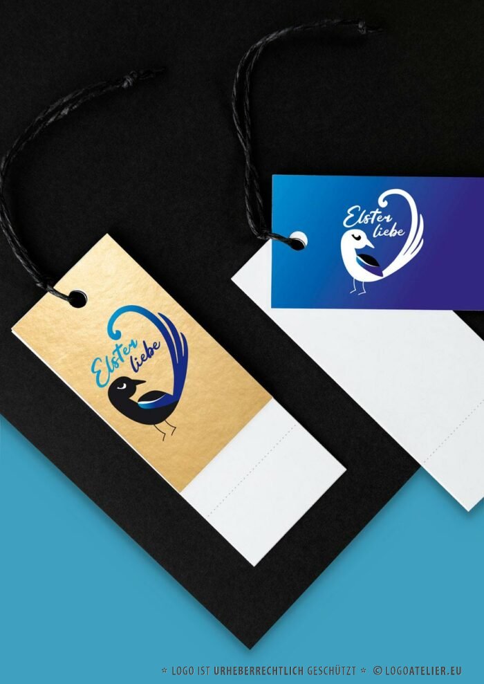 Die Farbpalette widerspiegelt den Elster Charakter. Kräftigeres Ultramarinblau und Blau mit einem Verlauf, Schwarz und Weiß. Der Font ist lebhaft und fancy, was zu diesem Logotype Konzept am besten passt.